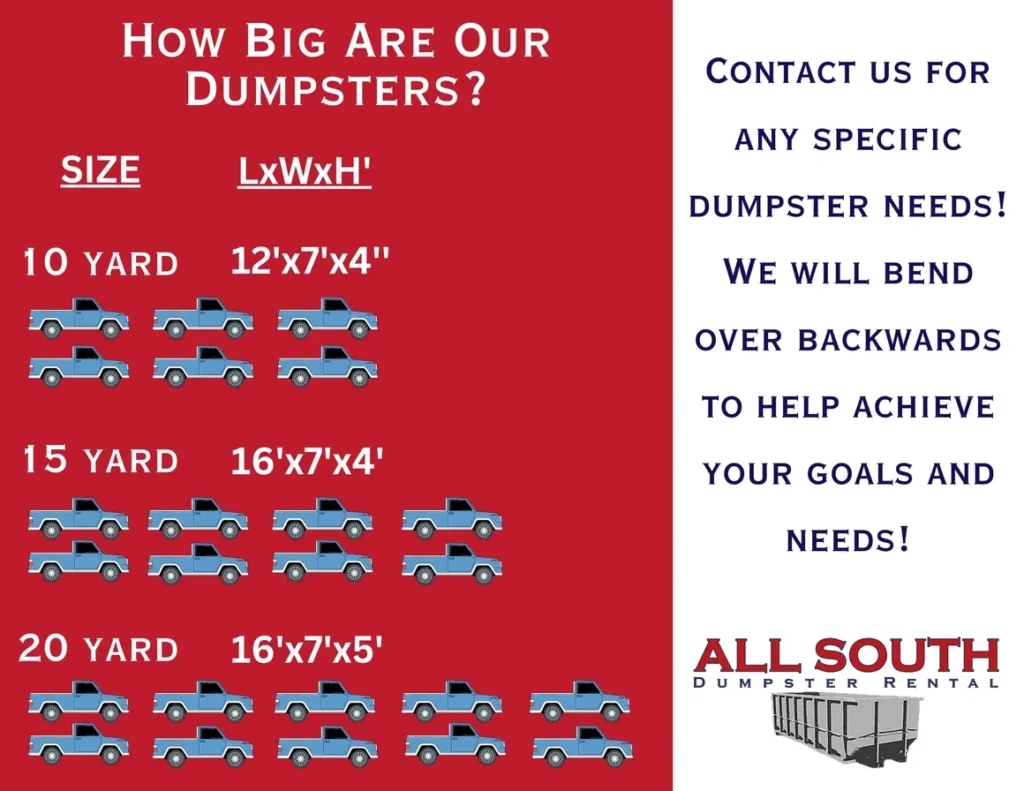 Posted on Kathleen AdamsTrustindex verifies that the original source of the review is Google. We needed to clean up a ton of downed tree limbs and debris after a bad storm, and this dumpster rental was such an easy and economical way to do that. Communication, dropoff, and pickup was seamless. It was just what we needed and we'll definitely use All South again.Posted on Kathy HouseTrustindex verifies that the original source of the review is Google. Awesome service. Definately went the extra mile to help me out. I would recommend this business and I will use them again!Posted on Marisa MichaudTrustindex verifies that the original source of the review is Google. I had to rent the dumpster we used for not a great reason, as we were cleaning out my dad's house after his passing. But they made it so easy and worked with us the whole way. I would definitely recommend this company to anyone who has dumpster needs and I will keep them im mind in case I need anything in the future.Posted on Shawn FordTrustindex verifies that the original source of the review is Google. This will be my go to for dumpster rental from here on out. Fair pricing, great communication and service, all within the expected timeline. Good, good, and good!Posted on Doug LucasTrustindex verifies that the original source of the review is Google. Great professional service and willing to help to create the best customer experience.Posted on Regina BaldwinTrustindex verifies that the original source of the review is Google. This is your place! Great pricing, quick scheduling, and fantastic customer service. I wouldn't call any other dumpster rental service!Posted on Robinson MartinezTrustindex verifies that the original source of the review is Google. Great pricing, all new equipment, prompt and super helpful. Would recommend to anyone needing dumpsters.